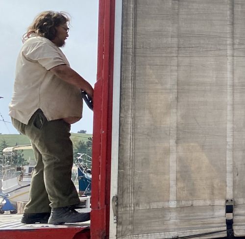 ... holt es aus seinem LKW ...